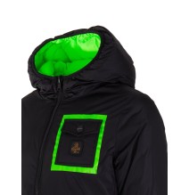 Giubbino bambino con cappuccio reversibile in colorazione nero e verde fluo con taschino sul petto con classico logo del brand in contrasto di colore. Modello con ampio cappuccio, maniche lunghe con polsini, chiusura sul davanti con cerniera, comode tasche laterali, fondo con orlo dritto e molla elastica in vita.