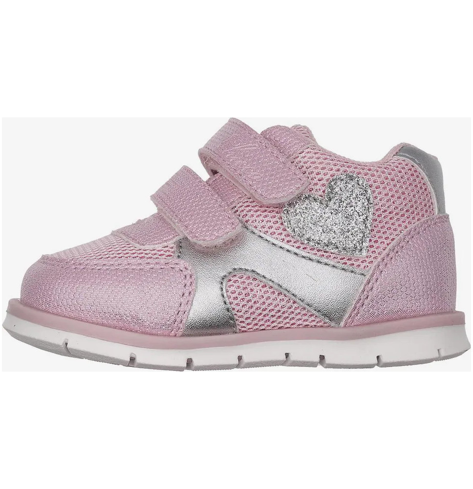 Sneakers primi passi da bambina con inserto in tessuto tecnico glitter e decorazione laterale a cuore